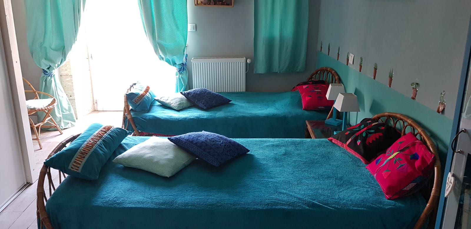 Une chambre à deux lits simples, avec porte-fenêtre donnant sur le jardin et une