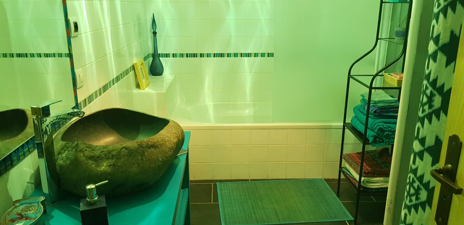 un balcon partagé avec une magnifique vue, sa grande salle de bains, douche à l'italienne et grande baignoire.